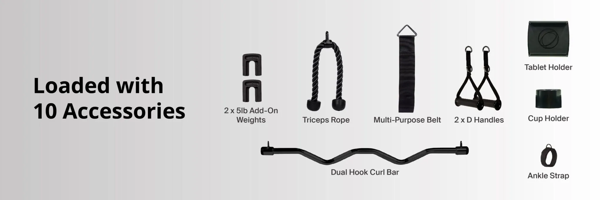 Included Accessories | (2) D Handles, Triceps Rope, Dual Hook Curl Bar, Ankle Strap, Multi – Purpose Belt, and (2) 5lb Add On Weights |