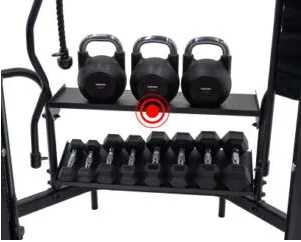 Includes a two-tiered horizontal rack with rubberized surface for safe and secure storage for your favorite free weights like dumbbells, kettlebells, wall balls, and more.